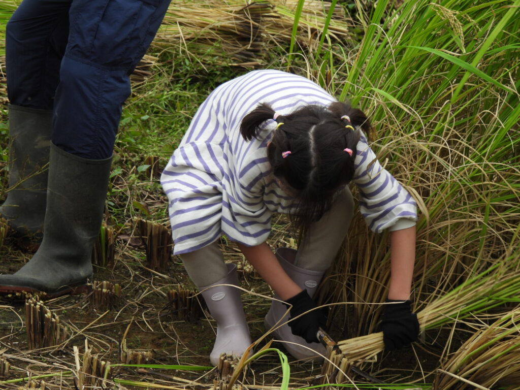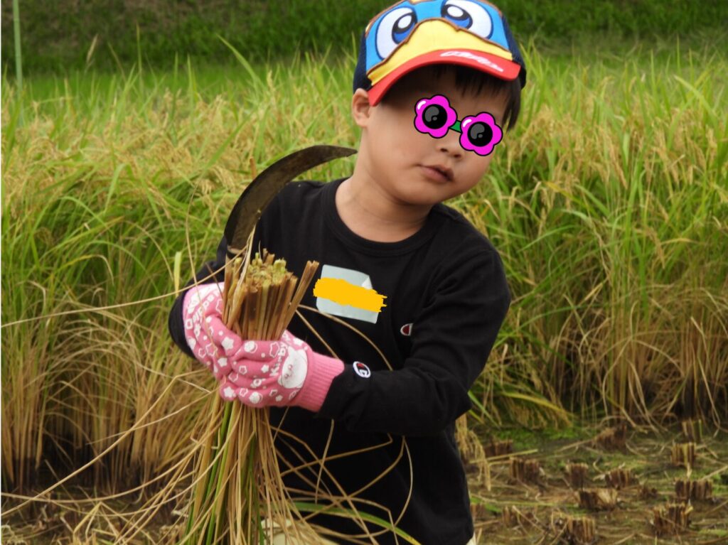 子供たちも率先して鎌を持って、嬉しそうに稲を刈り刈り雷