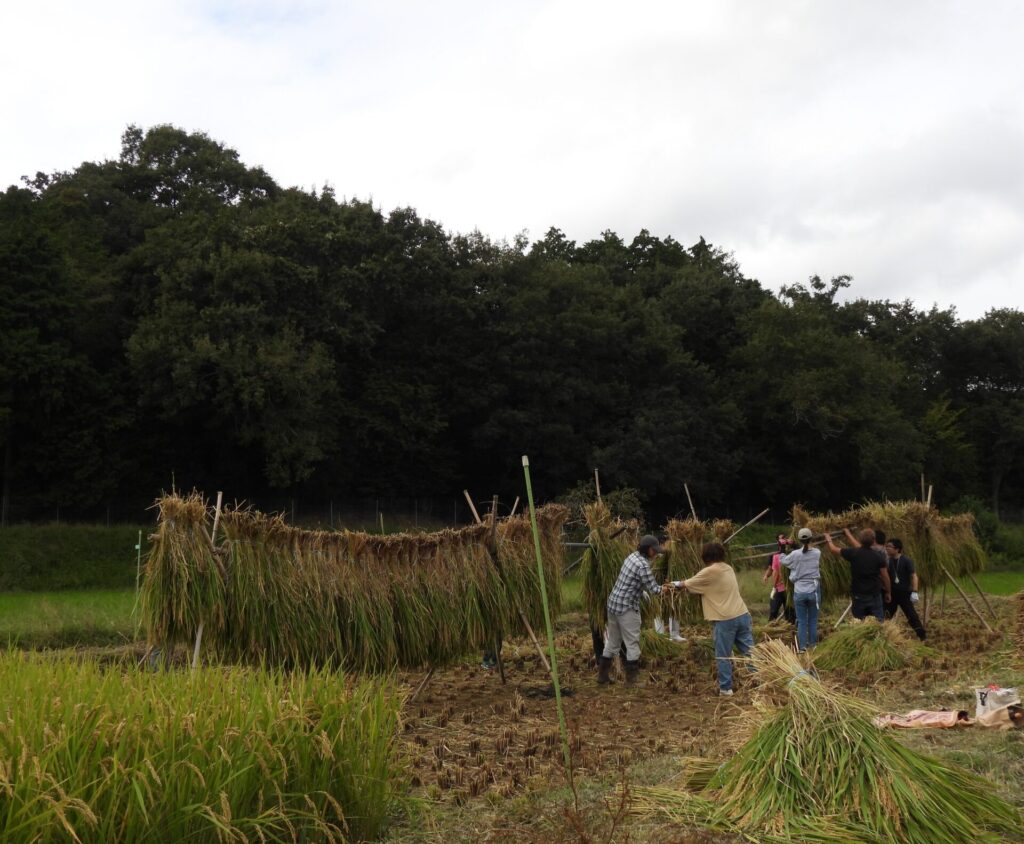 刈り終わったら、稲架掛け(はざがけ)へ指でOK