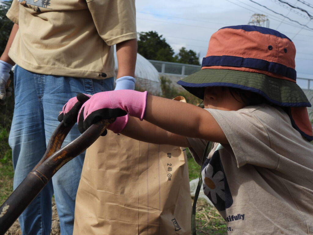 皆さん、米が30kg入る米袋に、いっぱいになったさつまいもを各自の車へ重そうに運んでいましたがまん顔