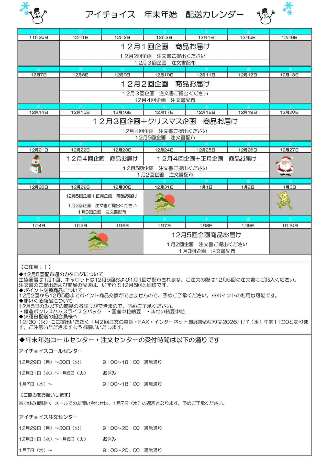 【年末年始コールセンター・注文センターの受付時間】