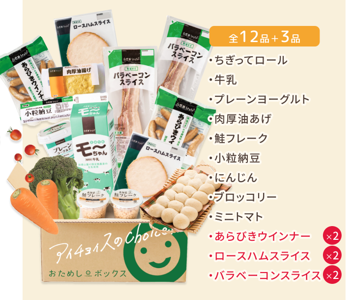 ※ おためしボックスは、アイチョイスに未加入の方限定で購入いただけるセットです。農産物(にんじん・ブロッコリー・ミニトマト)は季節や天候、産地の都合により内容が変更になることもあります。